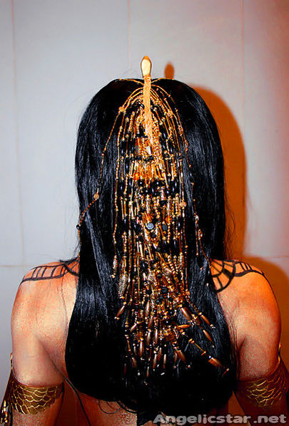 All painting aside, the accessories were also vital to this outfit. I studied the references for a long time and then set out to replicate them. Because all my beading supplies were packed away for a move, I had to buy everything including beading needles and make it all from scratch. The wrist cuffs, Horus arm bands and ankle cuffs are made of foamie sheets; the beaded belts, necklace and hair piece took several hours of beading, and I made the belt sashes out of a beautiful curtain material. I made the tiny cobra out of model magic, and wore sandals instead of going barefoot to adhere to hotel policies. The only other piece of clothing I wore was a black thong, as I didn't want to appear naked with a tan or gold one. I did also wear pasties that were painted over and blended into the design. My wig is the same one I used for Cleopatra.