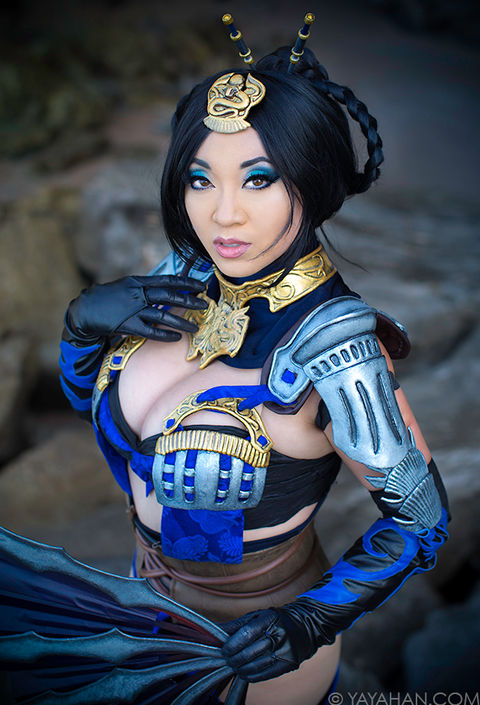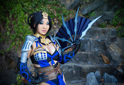 It was a mad dash to collect materials and create the outfit from scratch, only days before the scheduled trip departure, and make it collapsible (those fans) for my limited luggage space. Luckily, my material hoarding habits paid off and I had almost everything needed laying around for the creation of the costume. Kitana is made almost entirely from remnant fabrics, including a 10-year-old stash of blue brocade that I dug up from my basement—no joke. I made Lei Fang's dress from Dead or Alive with that fabric in 2007, and now it's a part of another fighting game cosplay!! The dark blue jumbo spandex on the mask and bodysuit is leftover from Psylocke, the black pleather is from Batgirl, and the blue designs on my arms were cut and stitched lambskin leather, bought originally for a different Kitana costume, and never used.