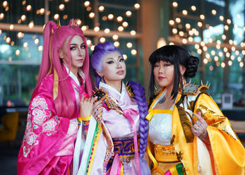 We did a lot of research on Korean hanbok and how to construct them properly. We kept in mind that these are stage outfits for popstars and not traditional hanbok and had some fun with the sewing portion of this project. As someone who has made multiple Chinese hanfu and is familiar with this style of garment sewing, I selected a medium weight liquid satin as the hanbok fabric and guided our group through the patterning process. Each cosplayer did their own sewing, and we coordinated with each other on techniques, details and accessories for the whole set of costumes.